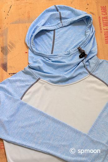 フードと袖の部分は Capilene Cool Daily Tee と同じ生地を使っています。この生地、本当に薄くて軽くて速乾性抜群。丈夫でお洗濯してもヨレヨレにならないし、柔らかくて肌触りも良いので私のお気に入り。身頃の部分はちょっと違う生地なのですが、こちらも快適です。