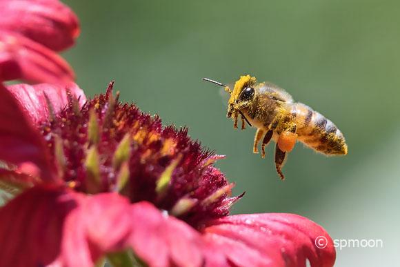 働きバチは花の蜜を吸った後、その蜜を少し吐き出して、足に生えたブラシ状の毛に湿り気を与えます。