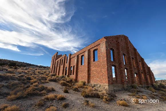 Tonopah(トノパ)の町から北東へ約50分のドライブ。US-6 から SR-376 を約13マイル北上、右折してSR-82 を約27マイル進むと町の中心部に到着します。この道はそのままメインストリートになっています。Leon Street との交差点に掲示板があってポイントが表示されているので、廃墟巡りの参考にすると良いです。