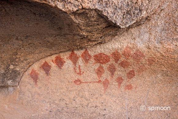 ピント文化の人々は、アトラル(投槍器)を使用して狩猟をし、植物を採集しながら季節ごとに移動生活をしていたとのこと。この頃のものと思われるシェルター、陶器や石器の欠片などが残っているそうです。その後この地域には、 Serrano、Chemehuevi、Cahuilla という部族が住んでいます。それぞれの壁画がいつ頃描かれたかはわかりませんが、きっと彼らが残してくれたものなんですね。