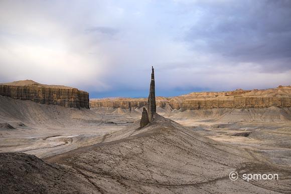 灰色がかった高い崖が連なる大地に、ポツンと佇む大小2つの岩柱。