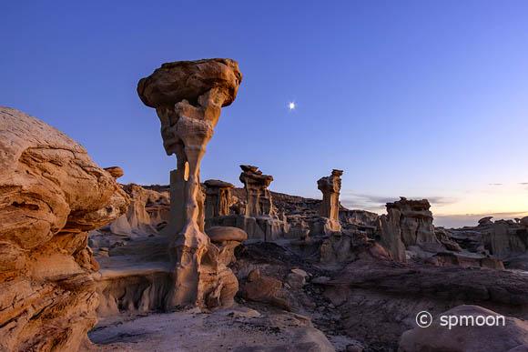 それにしても本当に魅力的な岩。 Hoodoo(奇岩)マニアとしては、どうしてもこの岩を撮影してみたかった。今回私たちは夕暮れの撮影をすることにして、町まで戻ると遠いので近くでキャンプすることにしました。通常の行き方ではなく、東側にある(Valley of Dreams East)と呼ばれる場所からのアクセスです。
