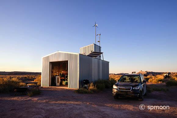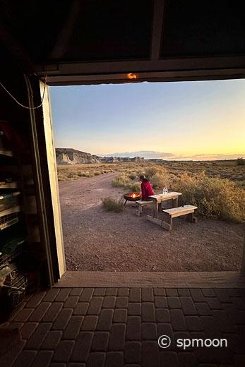 とにかくここは、砂漠の大地を独り占めしたような気分になれる素晴らしいロケーション。オフグリッドで公的インフラへの接続はありませんが、ソーラーの電気が使え、トイレは水洗で、シャワーもちゃんとお湯が出ました。寒い日にはペレットストーブをたくこともできます。