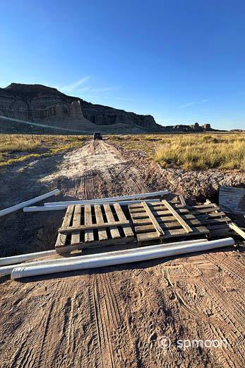 かなり大きく深い溝あり、それを埋めるために木製パレット、タイヤ、岩、プラスチックの棒などが乱雑に重ねてあります。木製パレットからは大きな釘がむき出しになっており、このまま渡るのは危険。私たちの車はハイクリアランスAWDではありますが、そこまで大きく頑丈なボディやタイヤではないので慎重にいかないと…。