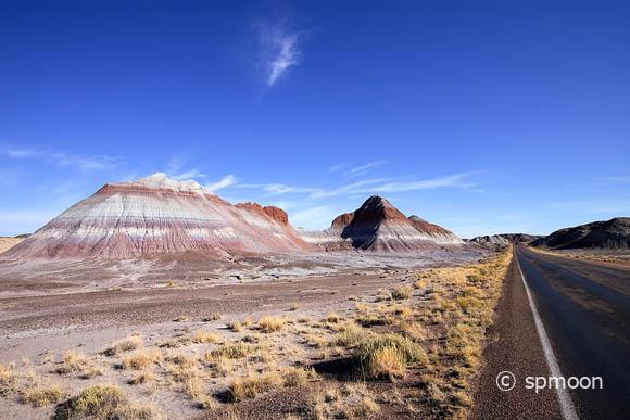 この公園に来たら必ず通るであろう道から見える The Tepees (ザ・ティピーズ)。テント型の美しい縞模様の山々。